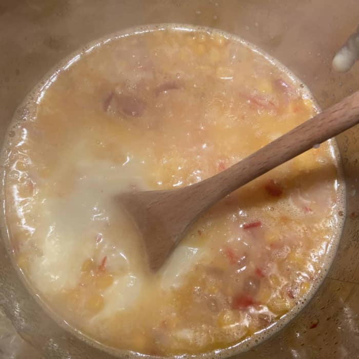 - Wenn der Mais gegart ist - so nach 5 Minuten - Brühe und Brei zugeben.
