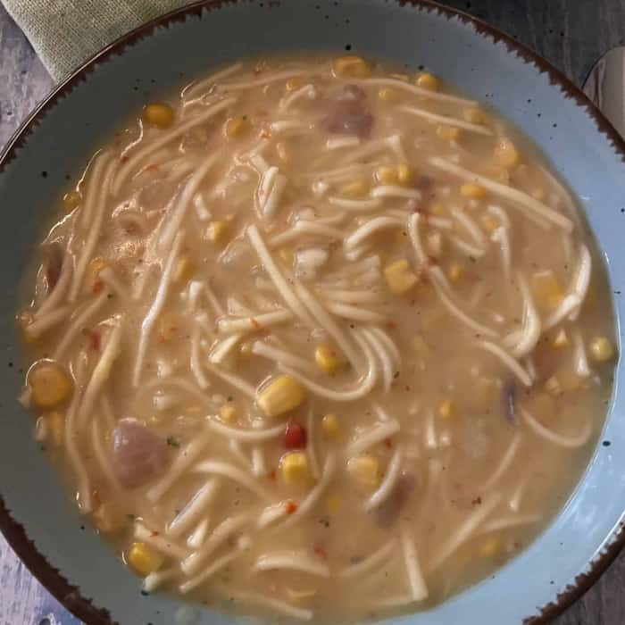 Kartoffelcreme-Suppe mit Mais funktioniert natürlich auch mit gekochten Kartoffeln, dann würde ich aber auch einen Schuss Hafermilch ergänzen.