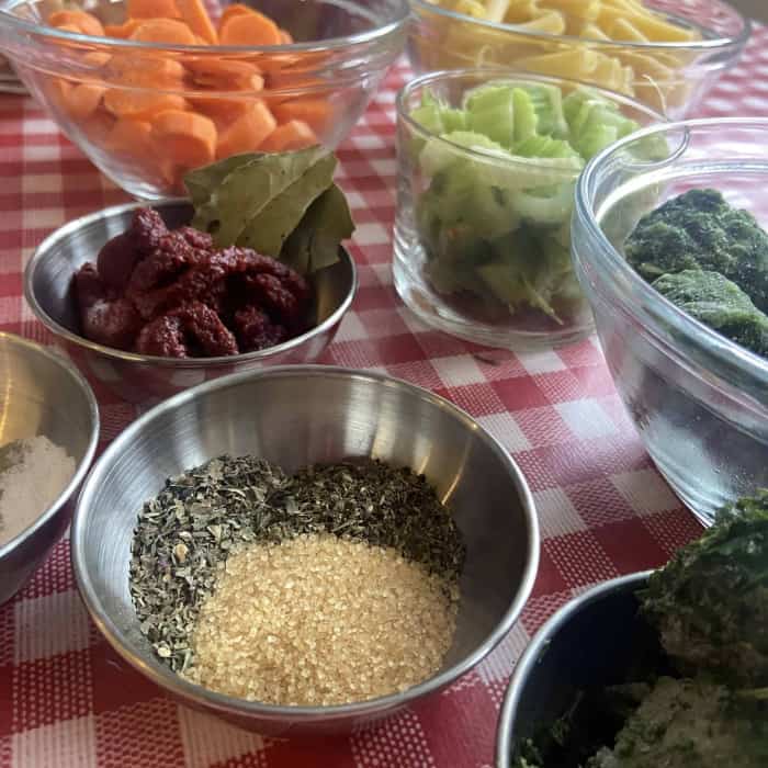 - Lorbeerblatt, Oregano, Basilikum, Salz, Pfeffer, Zucker und Pasta hinzufügen.