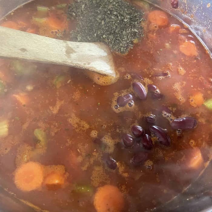 - Mit der Gemüsebrühe aufgießen. Kichererbsen und Kidneybohnen abspülen und hinzufügen.