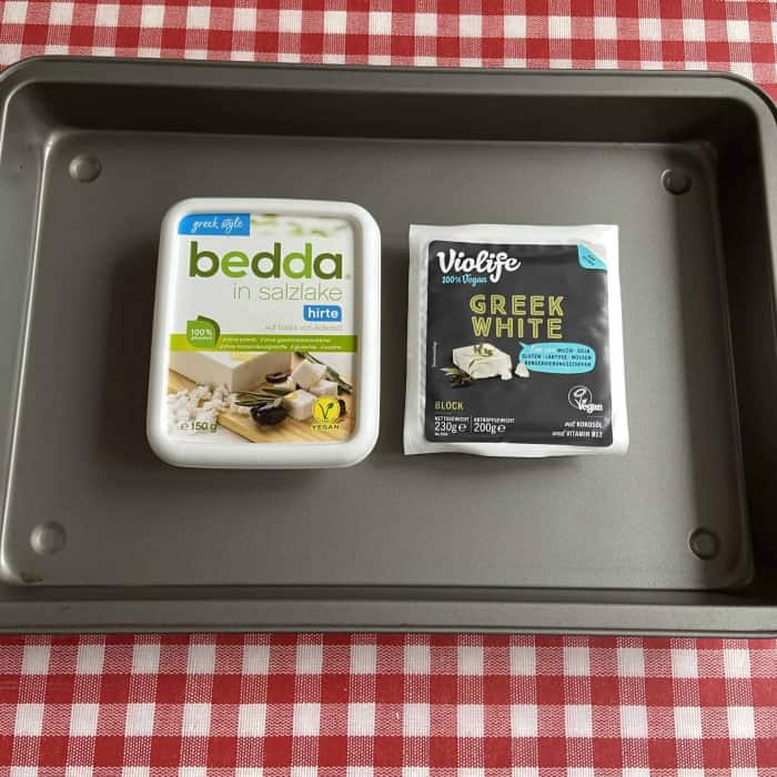 - Den veganen Feta-Käse grob würfeln und ebenfalls auf dem Blech verteilen.