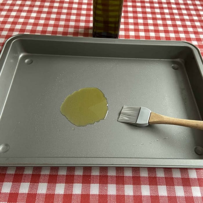 - Das Olivenöl auf dem Backblech verteilen, zum Beispiel mit einem Pinsel.