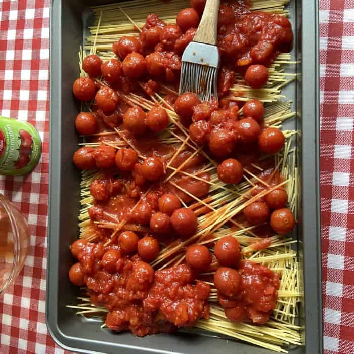 - Die Pasta aus der Packung legen und als gleichmäßig Schicht aufs Blech legen.