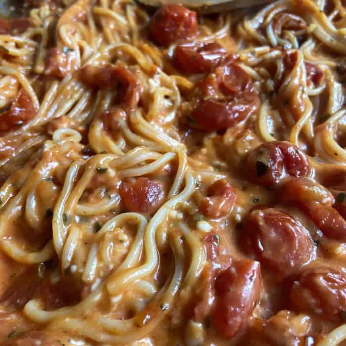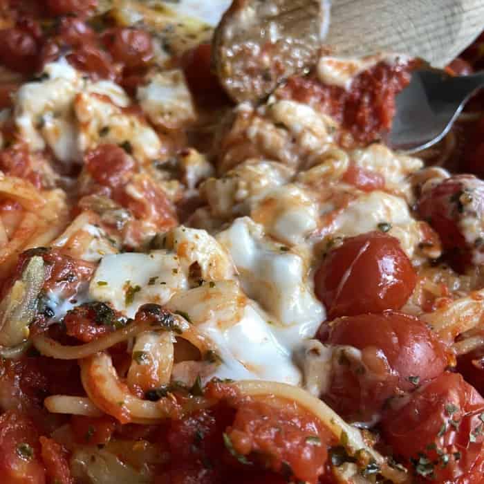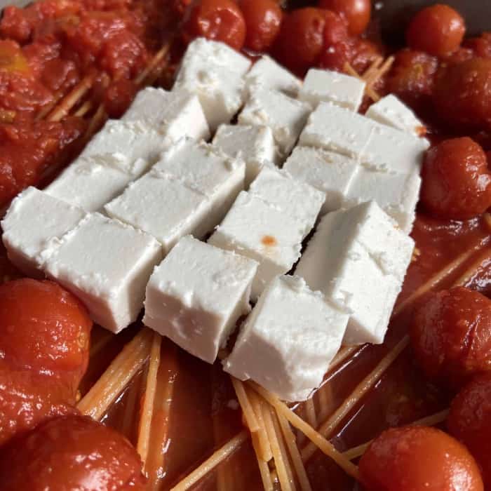 Das Originalrezept bringt Kirschtomaten mit Feta zusammen, die etwas nachgewürzt und in einer Schüssel gebacken wurden, bis der Käse geschmolzen war, um dann pragmatisch mit den gekochten Nudeln vermengt zu werden.