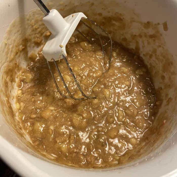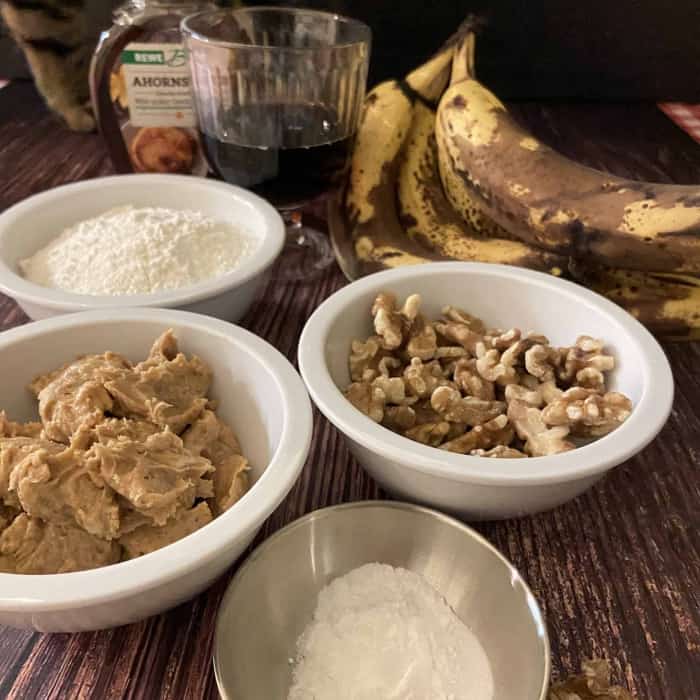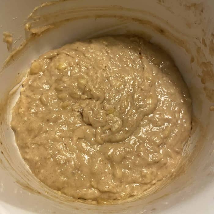 Erst alle trockenen Anteile miteinander, dann die Bananen fein zermatschen und mit Erdnussbutter und Sirup vermengen und löffelweise den Mehlmix unterrühren.