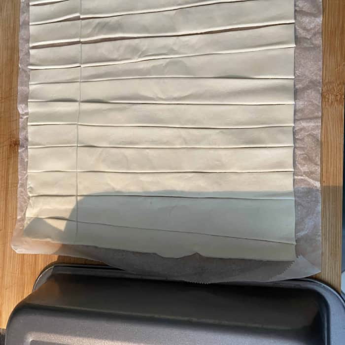 - Mit einem Pizzaroller den Teig in schmale Streifen schneiden, siehe auch unten den Tipp* dazu.