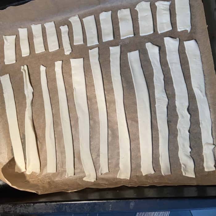 - Die Blätterteigstangen mit Abstand aufs Papier legen, backen und auskühlen lassen.