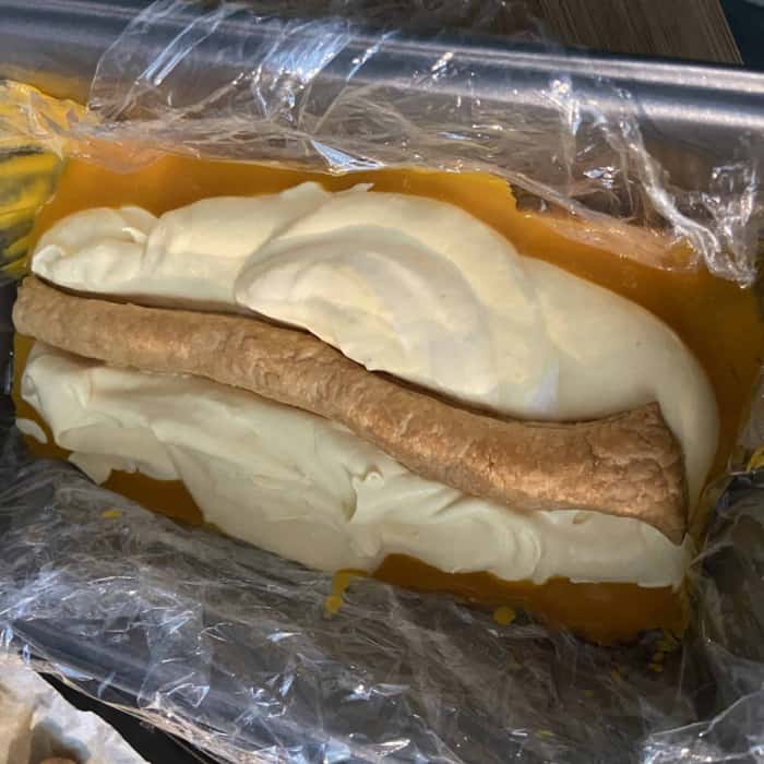 - Nun immer abwechselnd Mango-Sahne und Blätterteigstangen in die Form schichten, bis sie voll ist.