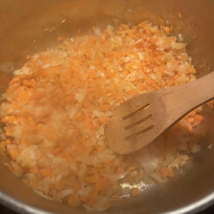 - Das Olivenöl erhitzen und die Zwiebeln, die Möhren und den Knoblauch glasig anschwitzen.