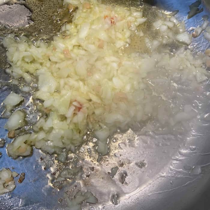 - Die gewürfelte Zwiebel und den Knoblauch hinzufügen und 3-4 Minuten lang anbraten, bis sie duften. Gewürze und Kräuter hinzugeben und unter Rühren eine weitere Minute braten.