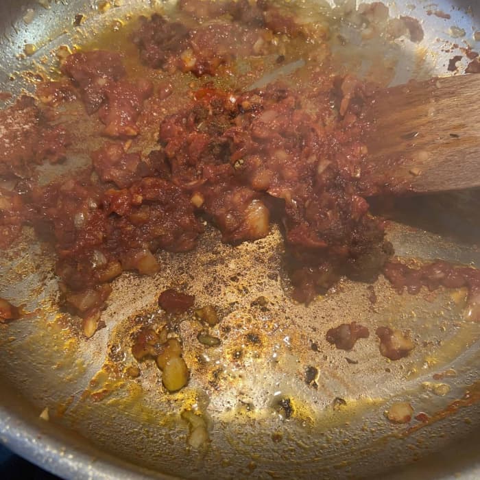 - Die gehackten Tomaten und das Tomatenmark hinzugeben und mit Salz und Pfeffer abschmecken.