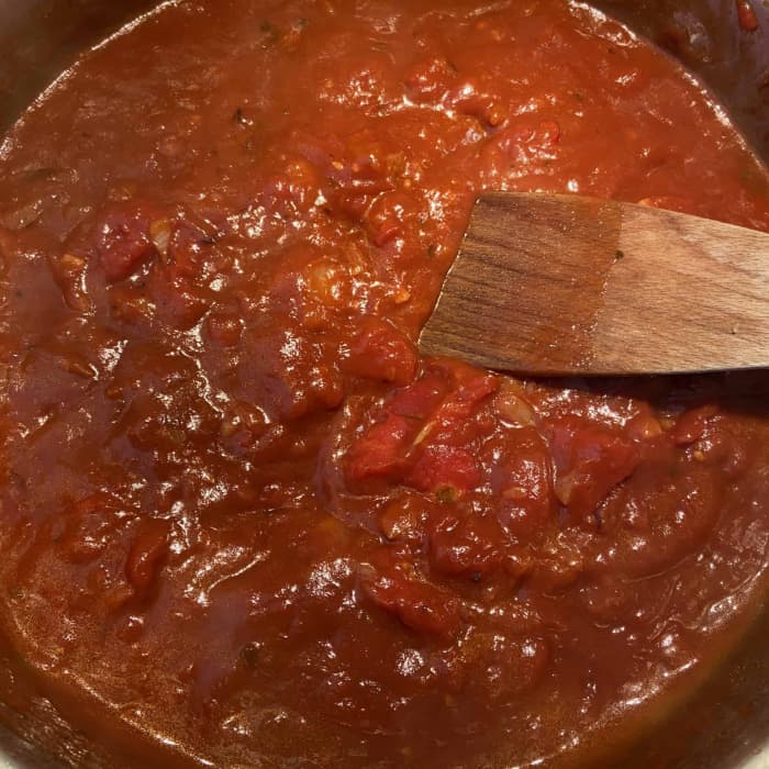 - Zum Kochen bringen, dann die Hitze reduzieren und 15-20 Minuten köcheln lassen, bis die Sauce eingekocht ist und eindickt.