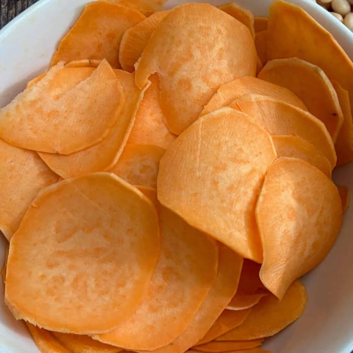 - Die Süßkartoffeln schälen und mit einem Gemüsehobel in hauchfeine Scheiben schneiden. 10 Minuten in Gemüsebrühe kochen.