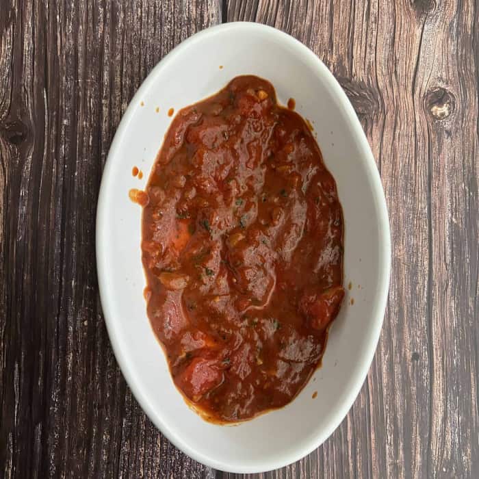 - Zum Schluss mit der restlichen Tomatensauce bedecken. Mit einem Stück Alufolie abdecken und ca. 30 Minuten im Backofen garen.