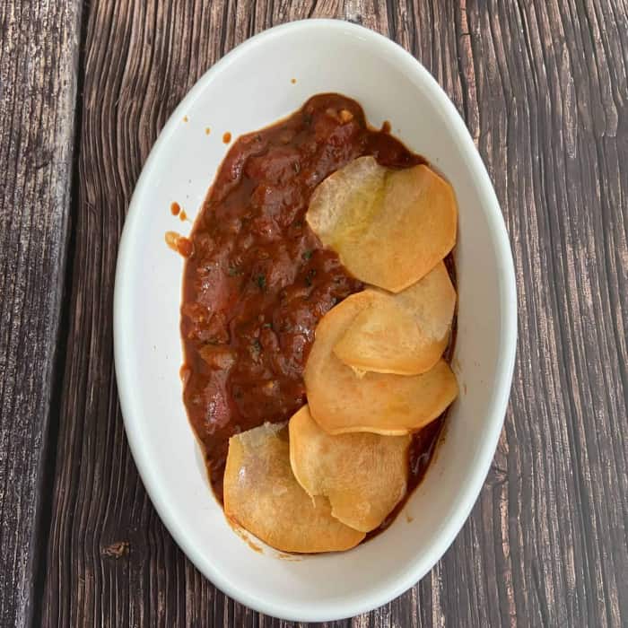 Im ersten Schritt bereitest du die Tomatensauce zu. Während sie köchelt, schälst du die Kartoffeln und hackst die Zwiebeln etc. und kochst die Süßkartoffelscheiben kurz vor. Wenn du dazu keine Lust hast, verlängert sich die Ofenzeit um weitere 10 Minuten (vor dem Käse).