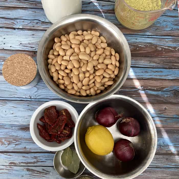 Ein einfaches Rezept für Bohneneintopf aus weißen Riesenbohnen in Mandelmilch-Zitronencreme - köstlich sauer und frisch.