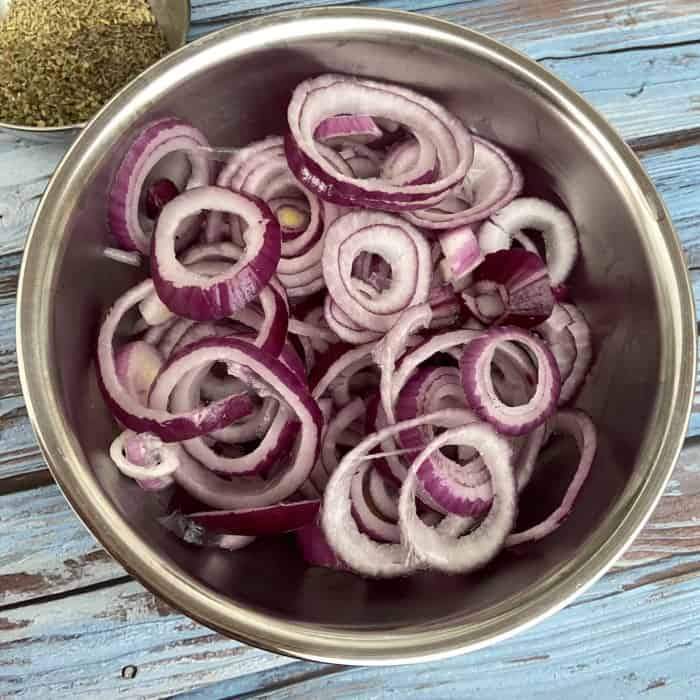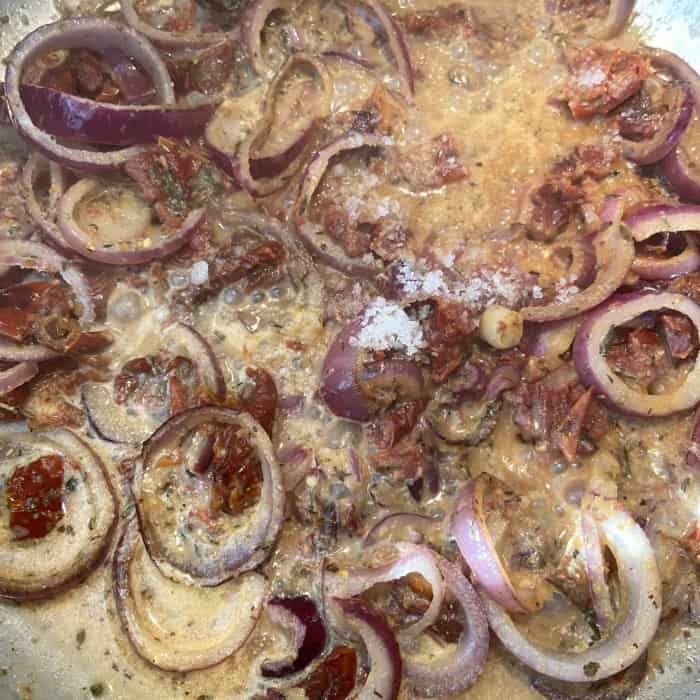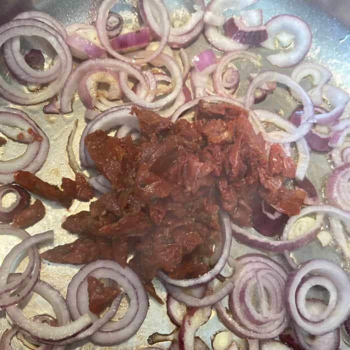 - Die roten Zwiebeln in grobe Ringe schneiden und die getrockneten Tomaten in kleine Fetzen.