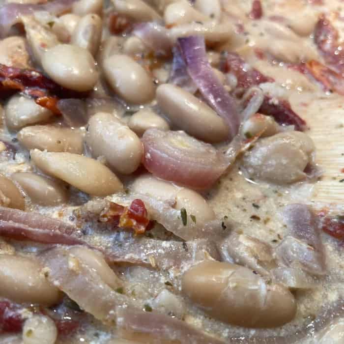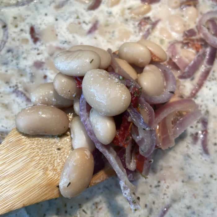 - Dann noch mehr Mandelmilch in die große Pfanne geben und die abgetropften weißen Bohnen hinzufügen, die Lorbeerblätter mit in die Pfanne geben und alles einmal kurz zusammen aufkochen.