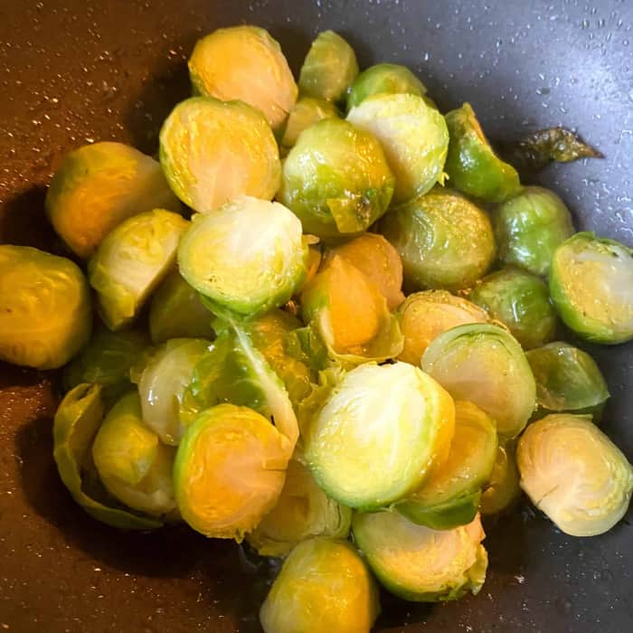 Wie bei so ziemlich allen unseren Rosenkohl-Rezepten gehen wir von geputztem und blanchiertem Rosenkohl aus.