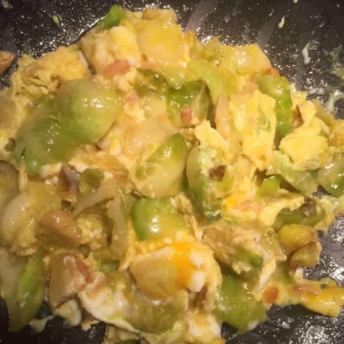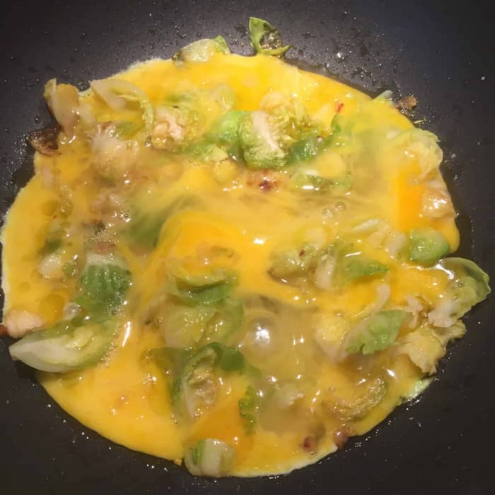 - Sobald sich die ersten gebräunten Stellen zeigen, die verrührten Eier ergänzen