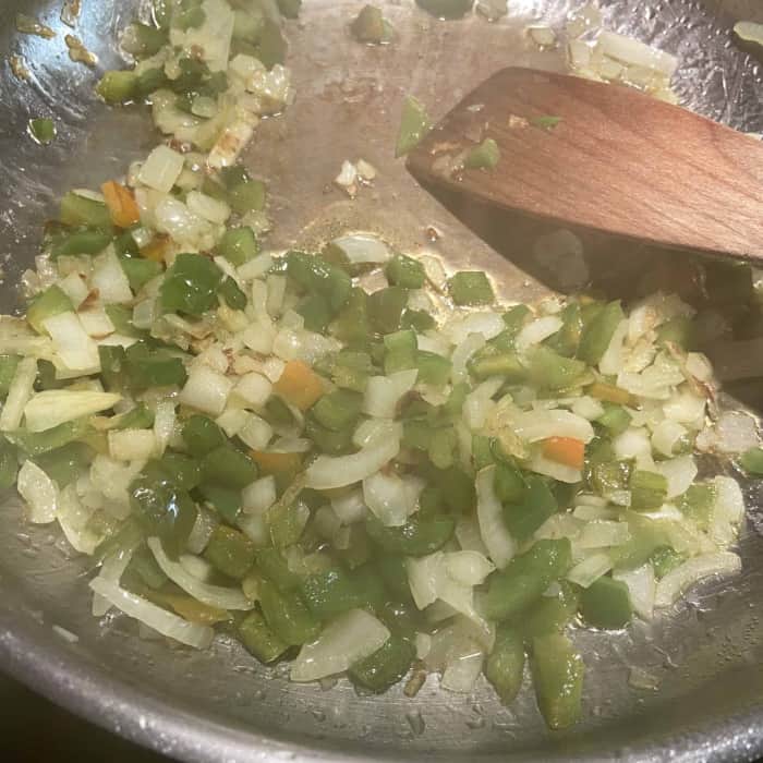- Beide zusammen im Olivenöl anschmurgeln, bis die Zwiebeln glasig werden und die Paprika weich.