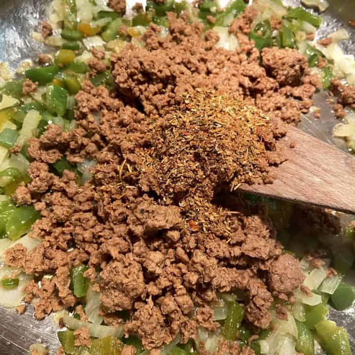 - Das vegane Hack und das Gyrosgewürz mit in die Pfanne geben, unterrühren und kurz scharf anbraten.