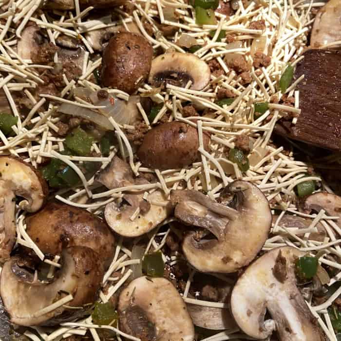 - Die Woknudeln hinzufügen und mit der Gemüse-Hack-Mischung vermengen.