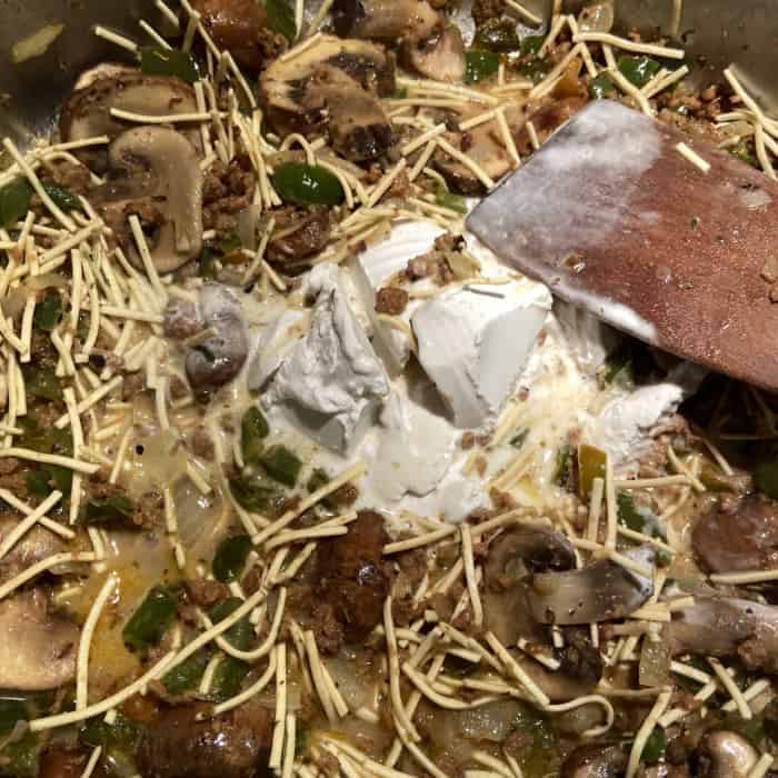 - Die in Scheiben geschnittenen Champignons mit zum Hack geben und unterheben.