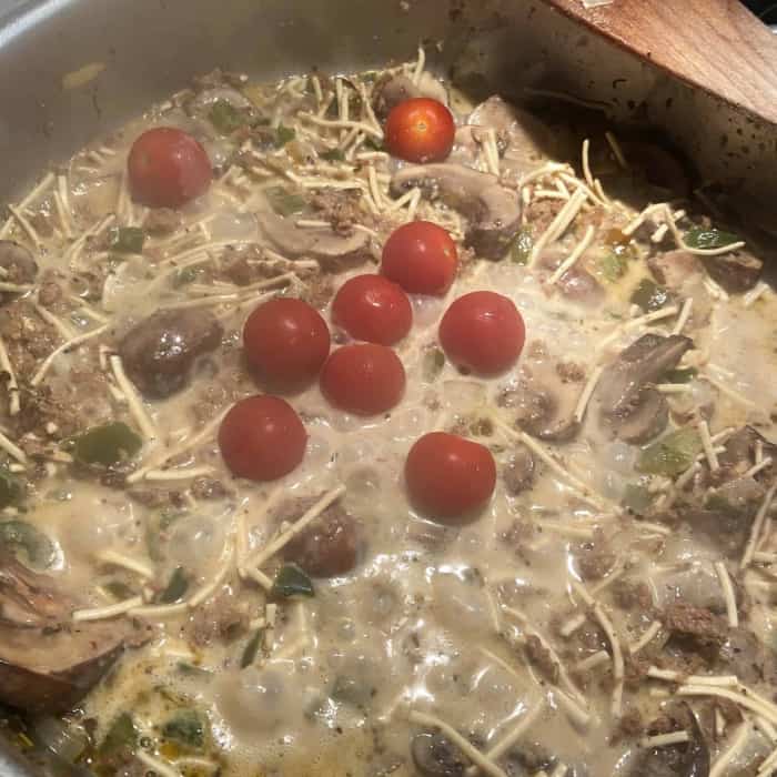 - Die doppelte Menge Champignons und Kirschtomaten nehmen bzw. je eine ganze Packung.