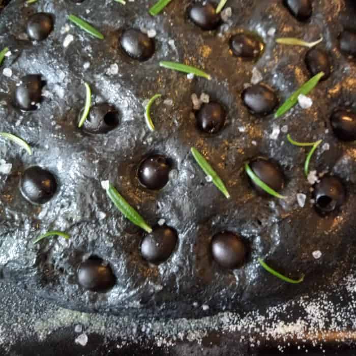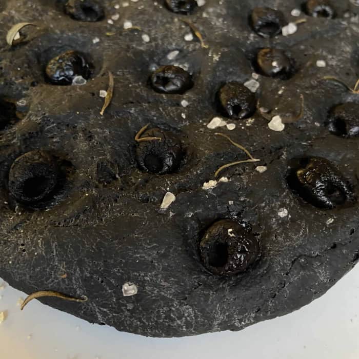 Wir haben schwarze Oliven und Rosmarin genommen, was in echt deutlich dramatischer aussieht als auf Fotos.