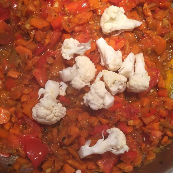 - Alles zerkleinern. Den Blumenkohl in kleine Bäumchen, die Möhren und Zwiebeln fein, die Paprika und Tomate würfeln