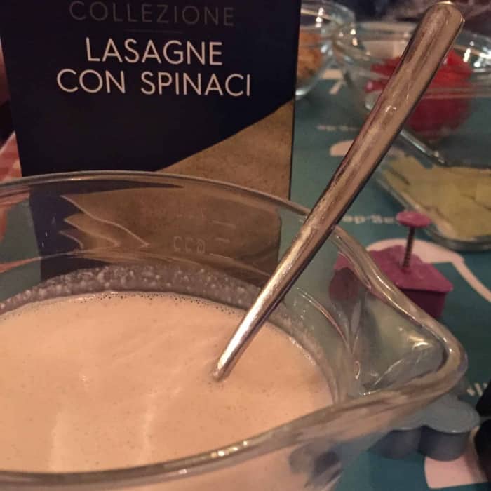 - Lasagneplatten + Spinat + Soße + gehackte Nüsse.