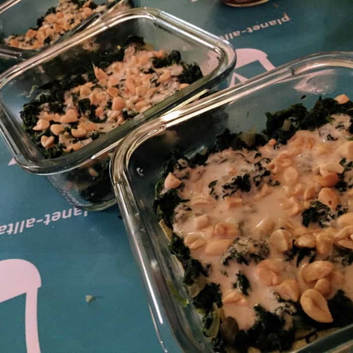 - Sosse, Lasagne-Platte, Spinat, Soße, geröstete Erdnüsse, immer wiederholen: