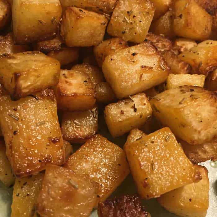 Eine große oder zwei kleine Steckrüben - wenn der Rosmarin nicht frisch ist, einfach getrockneten nehmen. Der Teil im Ofen lässt sich schon lange vorher vorbereiten, dann dauert es nur wenige Minuten, die vorgegarten Würfelchen in der Pfanne zu rösten.