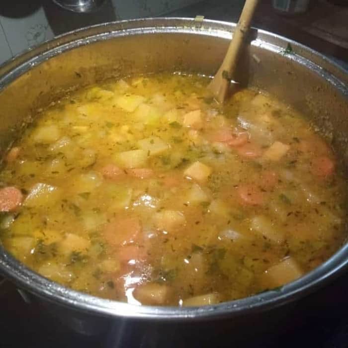 - Sobald der Porree ganz leicht braun wird, die Rüben, Möhren und Kartoffeln mit in den Topf geben, mit der Brühe aufgiessen und so lange Wasser dazugeben, bis alles bedeckt ist. Kochplatte auf volle Power stellen, bis alles kocht.