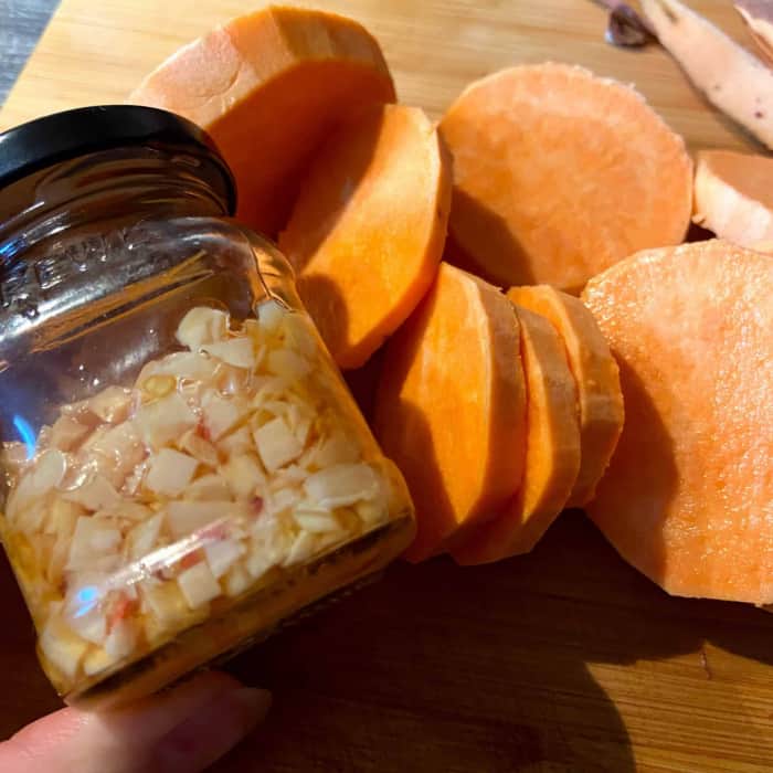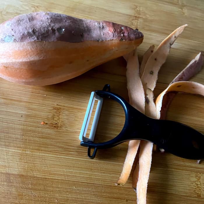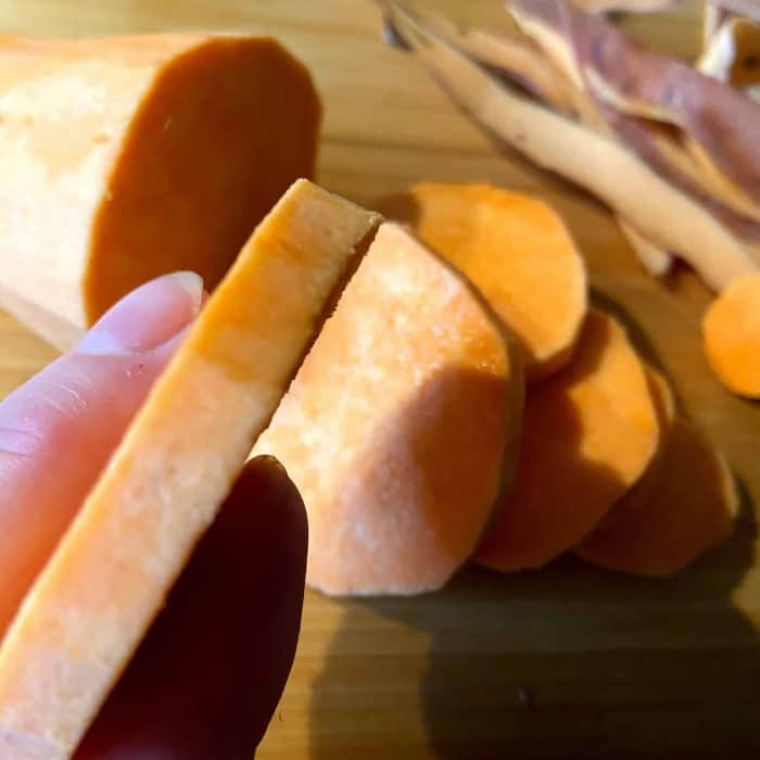 - Die Süßkartoffeln schälen und in einen Zentimeter dicke Scheiben schneiden.