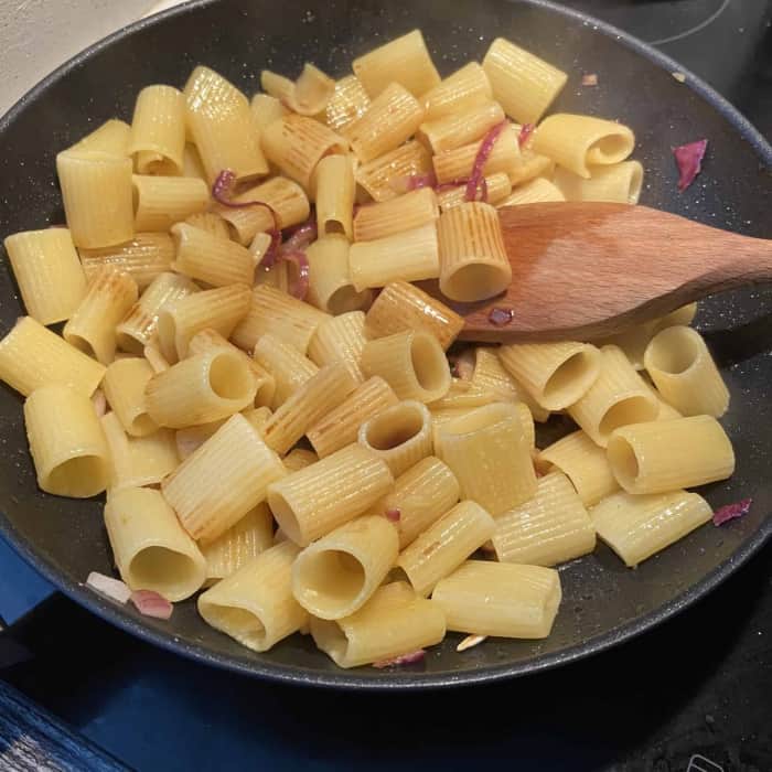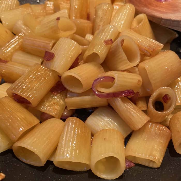 - In einer großen Pfanne die Zwiebeln kurz schmurgeln und dann die gekochten Nudeln dazugeben und leicht salzen.