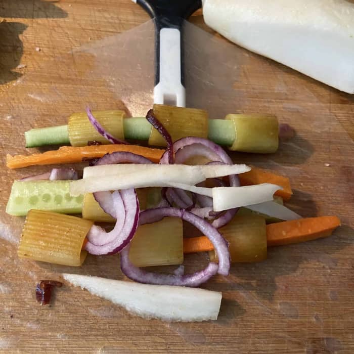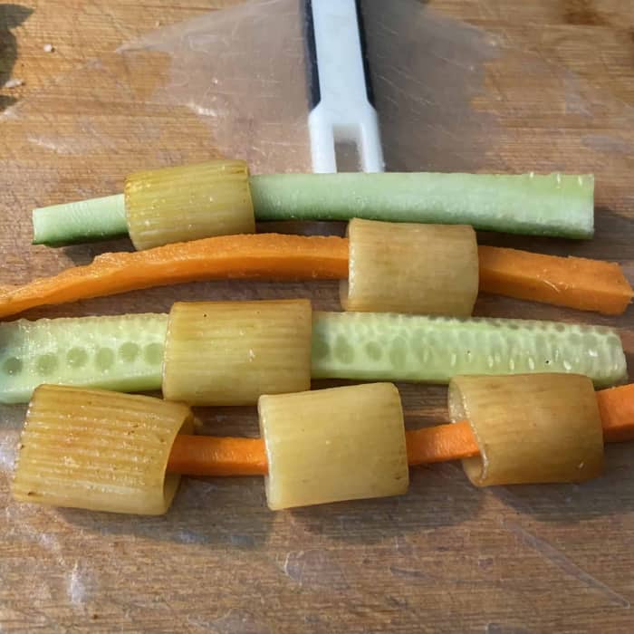 - Während die Pasta auskühlt, Gurken und Möhren in schmale lange Streifen schneiden.