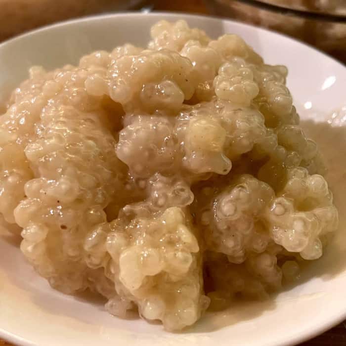 Der Tapioka-Pudding ist kompakter Glibber, bis du ihn mit einer Gabel etwas auflockerst.