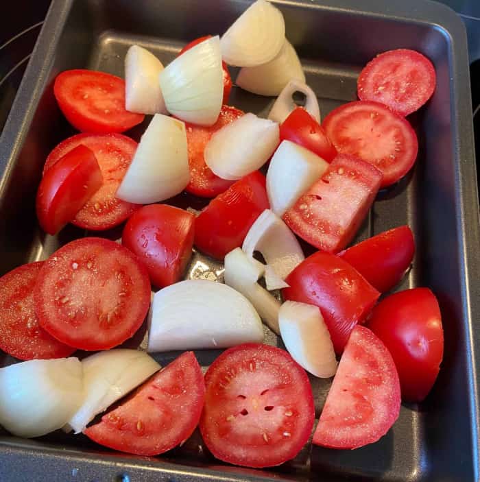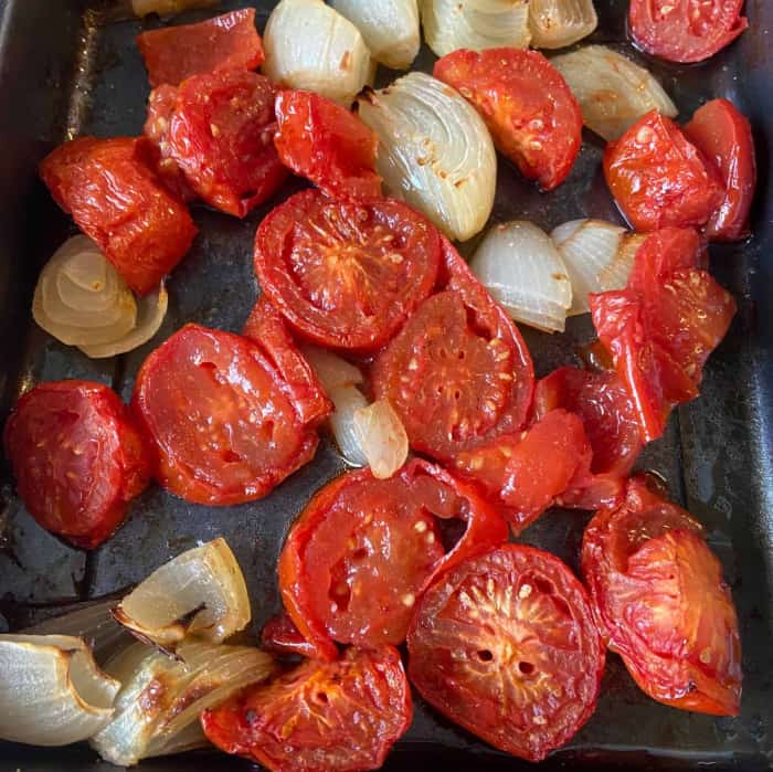 - Tomaten und Zwiebeln salzen und im Ofen für 30 Minuten rösten