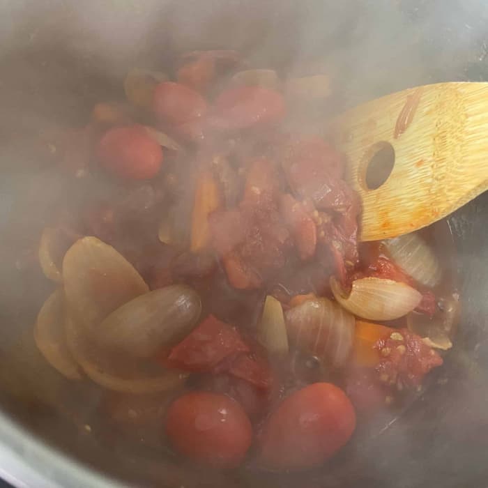 - Die gehackten Tomaten hinzufügen, alles einmal hochkochen lassen.