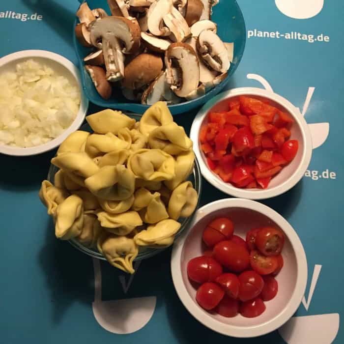 Die Tortellini sollten vegan gefüllt sein, aber Ihr wisst ja selbst, ab wann dieses Rezept vegetarisch oder fleischlastig wird. Ich liebe sehr die mit getrockneten Tomaten gefüllten selbst gemachten Tortellini, für die ich nie Zeit habe und nehme die erstbesten in bio.