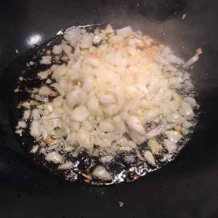 - Eine grosse Pfanne kräftig erhitzen, erst die Zwiebelstückchen