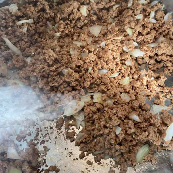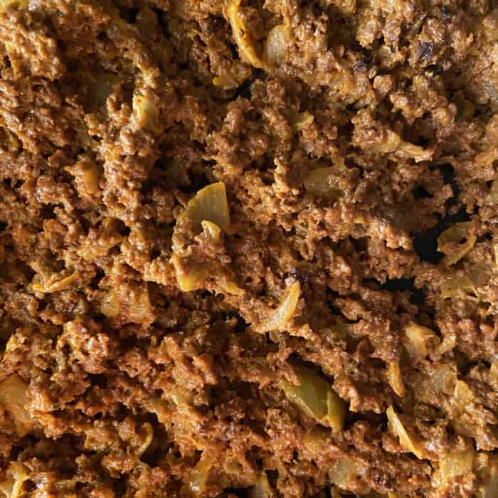 - Das Hack dazugeben und scharf anbraten, bis es dunkel anfängt anzukrusten.