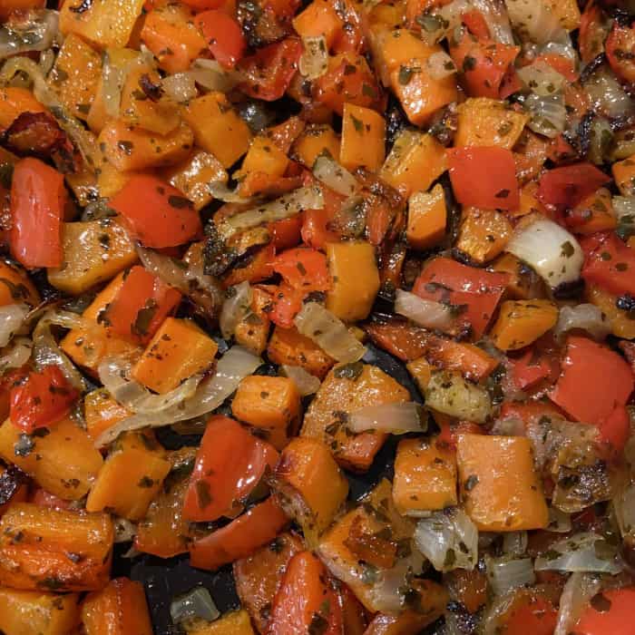 - Möhren und Paprika in grobe Würfel schneiden. Das Gemüse aufs Blech geben, Basilikum darüber.