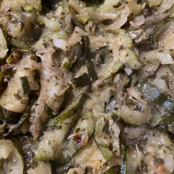 - Die Zucchini putzen und in schmale Scheiben (bisschen dicker als Gurkensalat) schneiden.