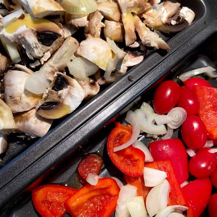 - Auf einem anderen “halben” geölten Blech landete die Paprika in Scheiben, mit den Tomaten und noch mehr Zwiebeln.