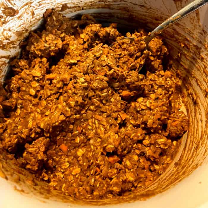 - Alle Haferflocken, die Zwiebeln und die Möhren gründlich unterrühren und den “Burger-Pattie-Teig” eine Stunde kaltstellen.