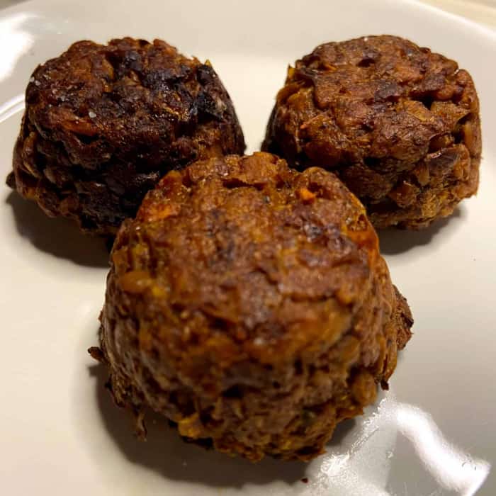 Oder beides, wie wir: Unser Rezept ergibt 48 vegane mini Burger Patties, die wie Fleischklößchen aufgespießt, auf kleine Burger gelegt oder in eine Pasta-Sosse geworfen werden können.