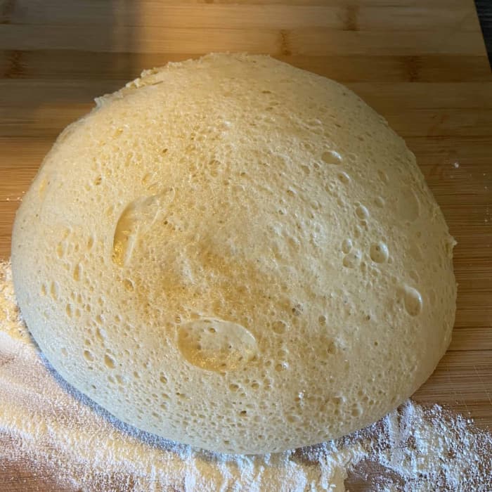 Den leicht aufgegangenen Vorteig hinzufügen und von der Küchenmaschine kneten lassen, bis sich ein seidig weicher Teigballen von der Schüssel löst.